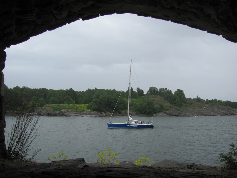 After 30 minutes it was still cloudy and wet, but the rain had at least decreased slightly. With umbrellas and hoods, we were among the first to leave the hut and headed for a new expedition of the island. The most interesting part was forthcoming. Above the burials there were large cannons with which we took pictures, and then we descended to the fortress walls from which windows we enjoyed interesting views. There was a lighthouse, boats and other landscapes that we captured with the cameras. We also stopped in front of the big gate with numerous steps reaching almost to the sea water. The rain had stopped, and we heard the sound of swords nearby. There was a performance, and a woman in medieval clothes was fighting a sword with a man. Another man, also in a theatrical costume, shouted in Finnish and gave instructions to the lady who won the battle and the whole audience applauded her.