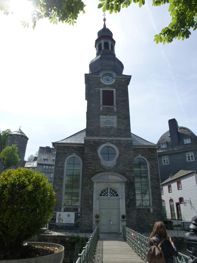 The aroma of freshly baked waffles separated us from the group. Located 2 km from the Belgian border, Monchau had managed to absorb and even perfect the recipes of its neighbors and offered some of the tastiest waffles in the world. The pretty cafes on the banks of the river, on the other hand, offered tranquility preserved over the centuries. However, we could not sit still, attracted by the castle jutting out onto the hill. We past the stone church and continued along the cobbled, slightly steep winding street. It was not the climb, but the wonderful panorama that took our breath away.