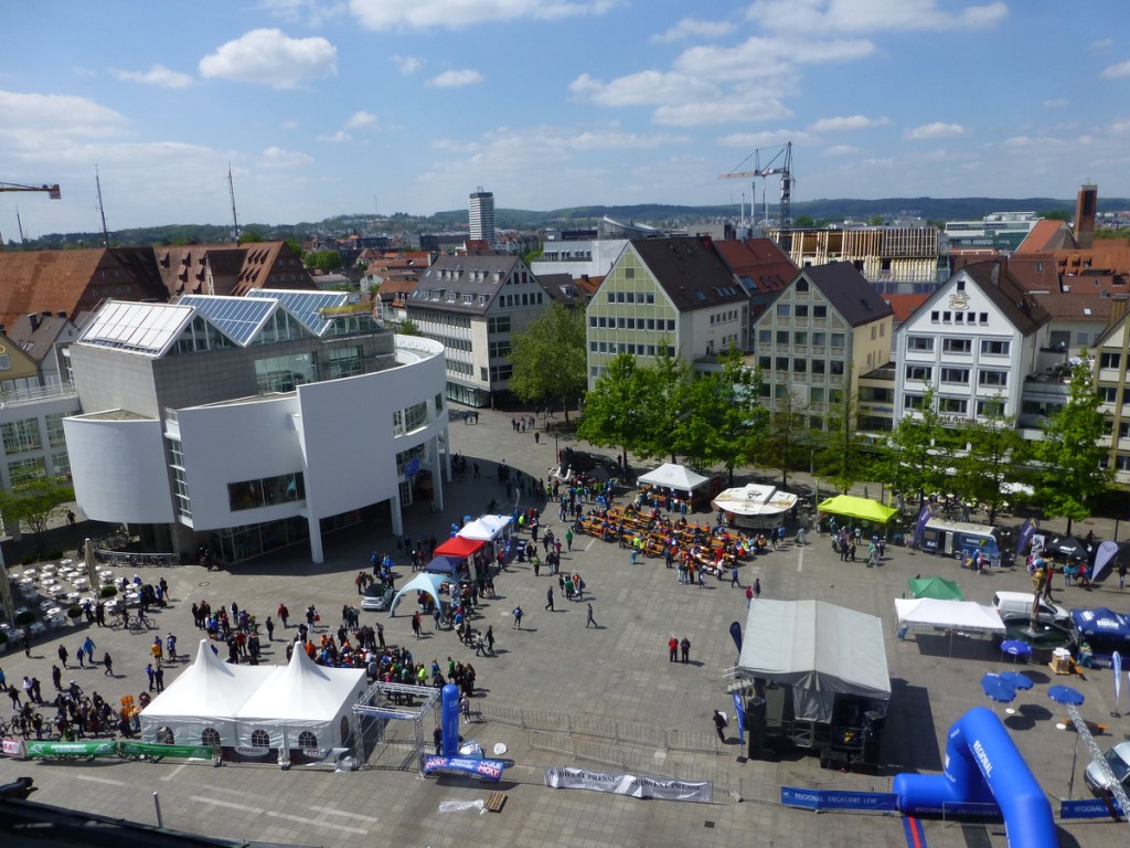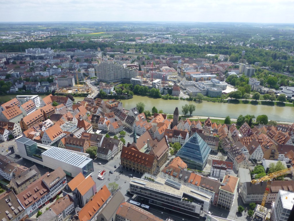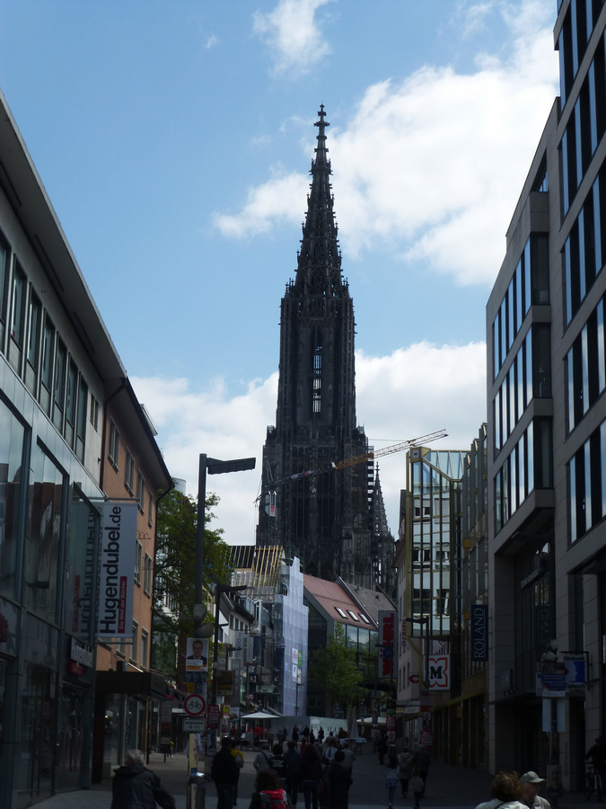 Our sunny walk around the city began around noon on May 4, heading from the station to the famous cathedral known for having the tallest church tower in the world. We walked along the pedestrian street Bahnhofstraße lined with shops. Before our arrival we have read that the town Ulm is mentioned as early as the 9th century as an important trading place. Its shops have apparently been preserved to this day, as apart from having rich traditions and history, they had also grown in number. Unfortunately, on this sunny Sunday they were all closed, so we headed to the busiest place on Sunday – the Cathedral Square. Münsterplatz was full with people preparing for an upcoming marathon. Instead of racing, we decided to calmly enjoy its beautiful architecture, which was a successful combination of history and modernism. And speaking of history, we couldn’t fail to mention the big inflatable mammoth that stood at the very entrance of the square and it looked like it was an advertisement, but we didn’t understand what it was for. Photographs with him, however, enhanced the impact of the grandeur of the city and the dominating beautiful cathedral.