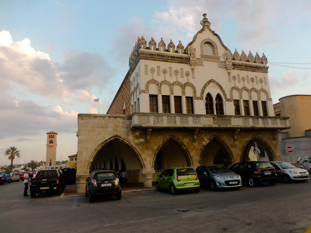 All buildings opposite the port were built by the Italians in the period 1912-1943, in the typical “fascist” design of Mussolini. Particularly interesting is the court building, above which the Greek flag waves, and below it there are seven round reliefs all of them the symbols of Rhodes.