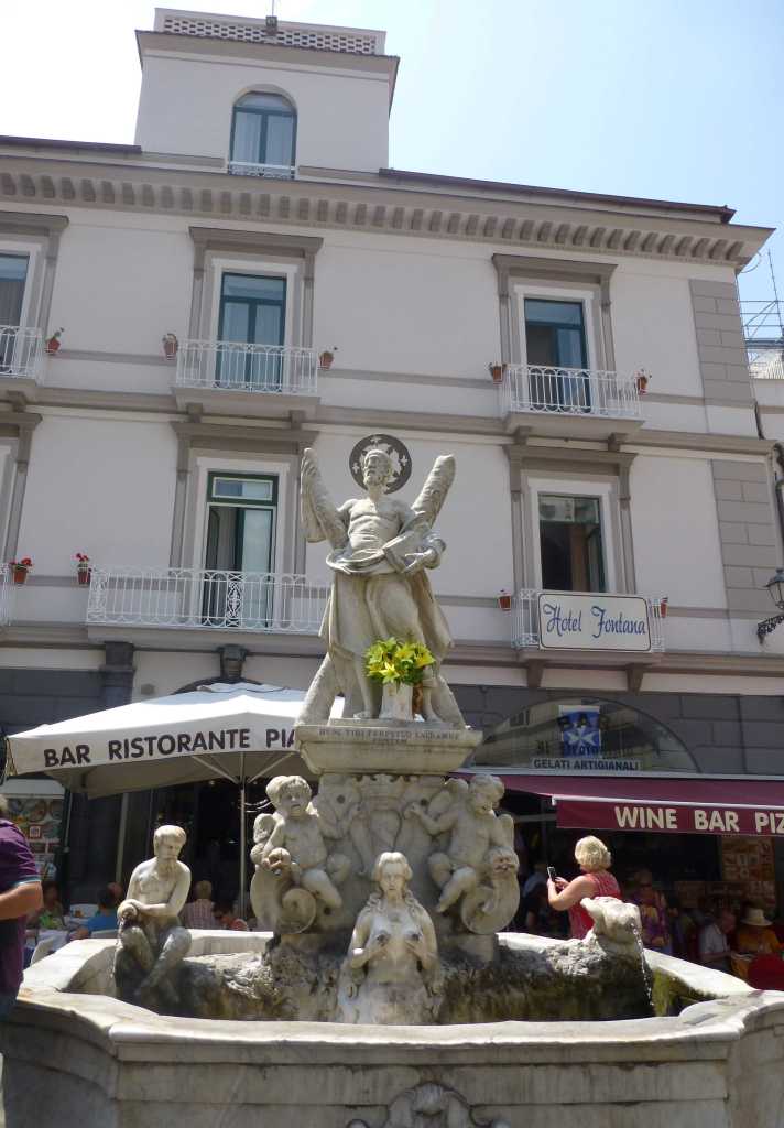 We walked along the central shopping street of Amalfi, where, in addition to shops, there were also several beautiful fountains. The first of them was the Fountain of St. Andrew overlooking the beautiful cathedral, erected in 1760 in the Baroque style. There was also an older fountain on the site, which was carried away and destroyed in a sea storm. The present one depicted the saint, at whose feet stood angels pouring water, and below them women, from whose breast also flowed water.