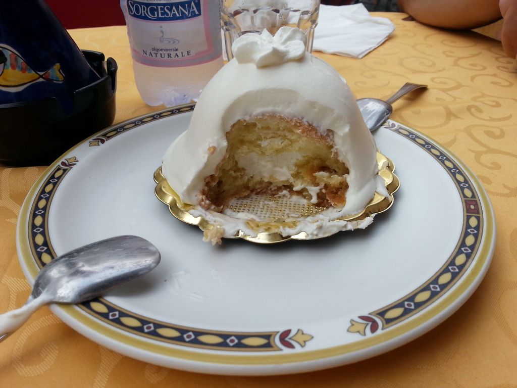 It was time for lunch and we sat on the sunny terrace of a restaurant right in front of the cathedral that impressed us so much. We ordered spaghetti with seafood and tartellini, and for dessert the traditional Amalfi pastry, which is a roar with lemon cream and doused with cream. It was very tasty.
