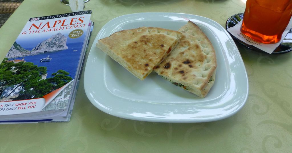 On our way, we stopped at a family restaurant, where we tried a very tasty local specialty resembling a thin loaf of bread stuffed with ham and yellow cheese or spinach and cheese, and we enjoyed both types very much. With renewed strength and a brisk step, we reached Villa Cimbrone, which is located a 20-minute walk from the city. Along the way, magnificent views of the terraced mountain and the Amalfi Coast were revealed.