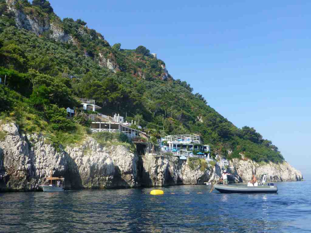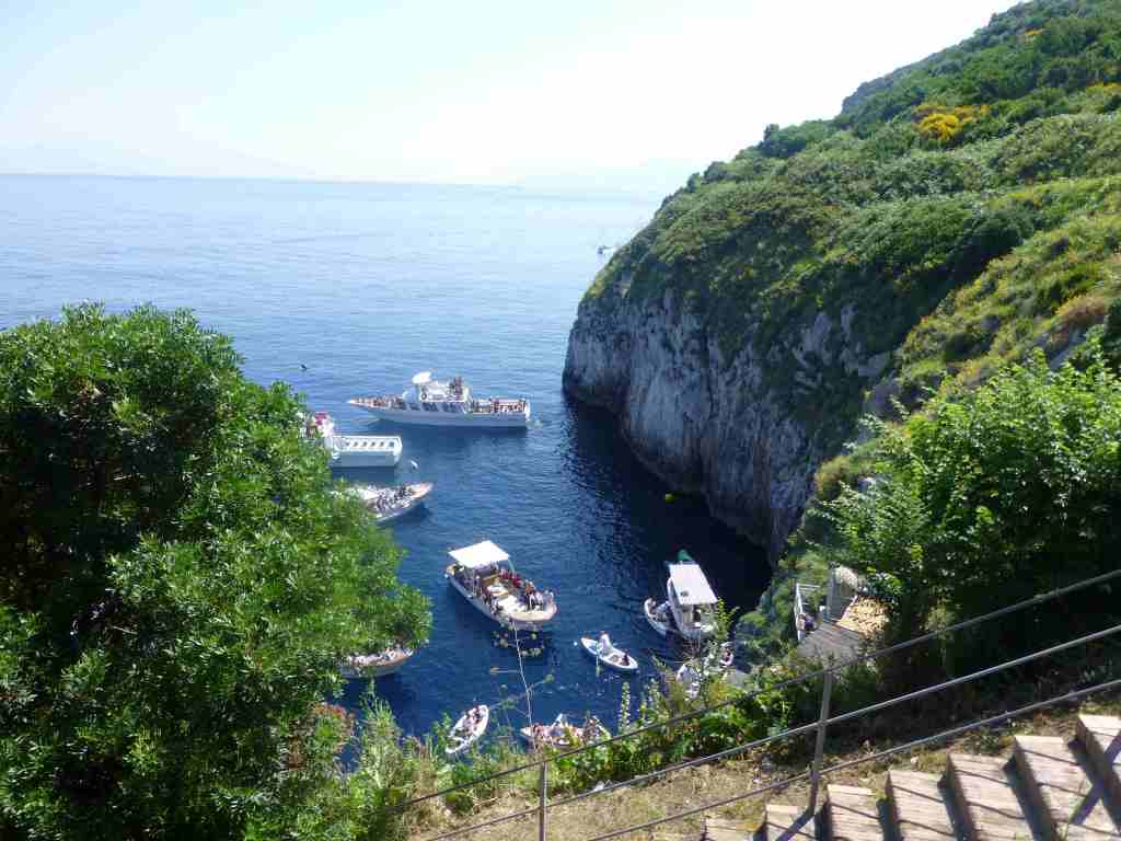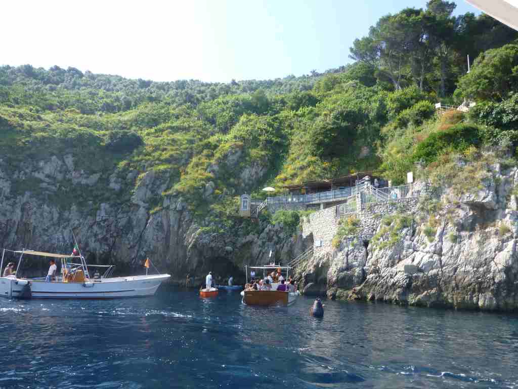 As soon as we arrived on the island of Capri, we boarded another boat at the port, which took us to the entrance of the cave. There we had to wait an hour to get on a smaller boat and make our way into the small crevice of the cave. Probably the long wait in the boat, the high price (17 euros per person to get to the cave and another 13 euros to enter it), as well as the too short stay inside spoiled the pleasure of visiting this attraction. The cave looked small, but it was actually 60 meters long and 25 meters wide, but our boat just came in, moved 2 meters in, and immediately took us back outside. Otherwise, entering the cave was really interesting. They made us almost lie on the floor of the small boats and thus squeeze through the narrow passage, which sometimes the waves completely hid from our view. Inside the cave it was dark and only the sunlight entering through two openings (one from which was the entrance) was reflected in the water and gave this deep blue color that gave the name of the Blue Cave or Grotta Azzurra. It turned out that several Roman statues were found in this cave, and it was assumed that Emperor Tiberius himself bathed here.