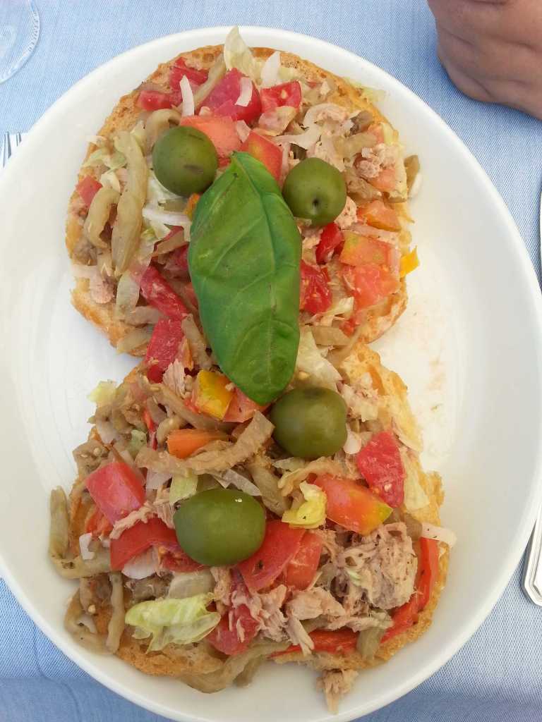 Typical foods and drinks: Italian cuisine is world-famous and Capri is no exception. As on every island, seafood is especially popular here. They prepare toast very tasty, on which they put slices of roasted eggplant, tomatoes, tuna and fresh red onion (photo on the left) – it is very delicious.