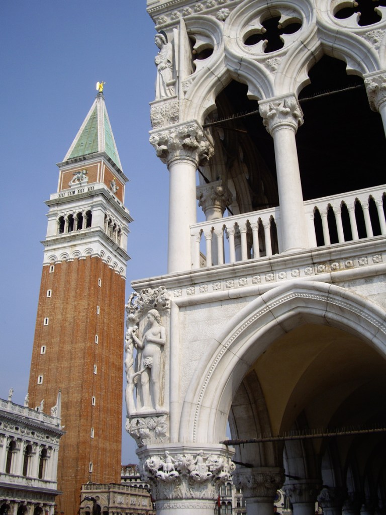 While waiting in line to enter the cathedral, we looked at the two columns erected in the square – one with a statue of the winged lion that personifies St. Marco, and the other with St. Todor – the first patron of Venice. There was also a long queue for the Doge’s palace, so after the cathedral we headed to the bell tower.
