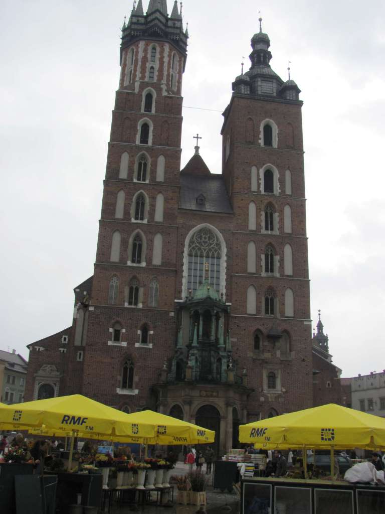 The central square was full of flowers stands and there were several open souvenir booths, which we duly appreciated. Despite the sullen weather, the Rynek Glowny square itself was very beautiful. According to brochures about Krakow, it is the largest medieval square in Europe, full of sights. Here is the 13th-century Gothic church of the Basilica of the Virgin Mary, which houses some of the most magnificent Gothic sculptures. From the tower of the church of St. Mary on every hour the music Hejnal Mariacki (trumpet signal) is played. This signal is music that spreads throughout the market square and stops abruptly in honor of the deceased trumpeter killed by the Tatars in 1241.