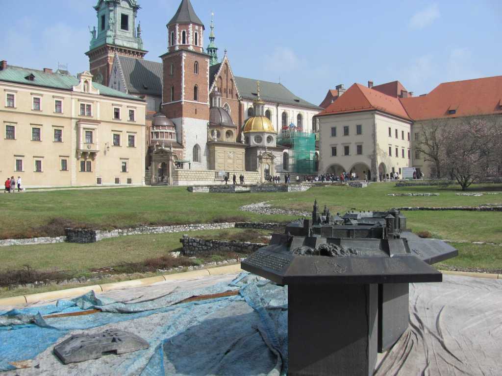 Wawel Castle was not so far away, and we quickly reached its magnificent hill. This castle was home to three dynasties of Polish monarchs, and according to the brochures, the halls are filled with priceless art, exquisite antique furniture, and old ancient objects. Of course, it was closed, but we walked through its inner park and past its beautiful cathedral. Renovation work was apparently underway in and out of the castle, as well as throughout Poland. The current summer, Poland, together with Ukraine, was going to host the European Football Championship and in addition to the many posters for this event, there were also many work activities, all along the beautiful tourist places.