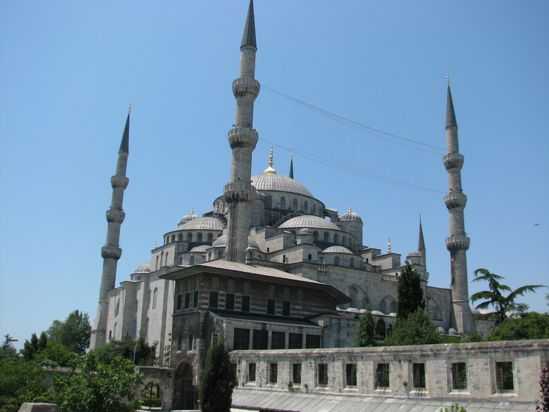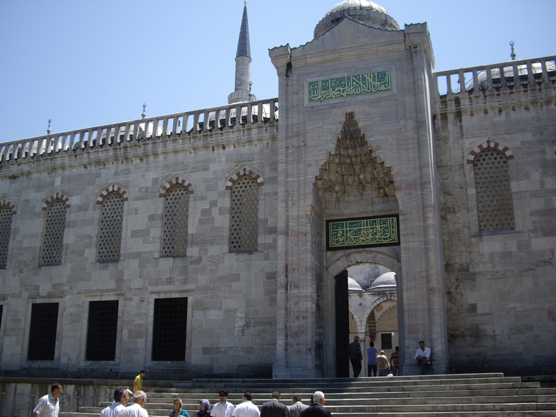 We headed to the next mosque of Sultan Ahmed, also known as the Blue Mosque, which was disappointingly not blue outside. We had to take off our shoes and go inside to see the interior that established this name with its blue and white porcelain tiles. It was the first mosque in the Ottoman Empire to have 6 minarets. According to the understanding, mosques could have only 4 minarets and only the Main Mosque in the holy city of Mecca had six. The Sultan settled the dispute. He ordered the addition of another minaret to the temple in Mecca. However, I was more impressed by the number of windows in the temple, which numbered 260. The room was really bright, not only from the outside light that descended through the colorful glass of the windows, but also from the huge chandeliers located in it.